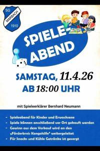 Am Samstag, 11.04.2026, findet ab 18 Uhr ein Spieleabend statt. Spielort ist das Sportlerheim der SG Marbach. Spieleabend für Kinder und Erwachsene Spiele können ausschließlich